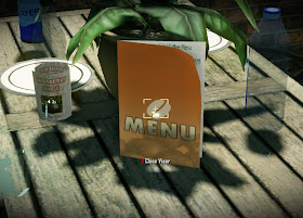 Here gather the coffe menue, juice bottle, water bottle with changed shader, wood table, the leaves of the plant and its pot. / Aquí se juntan el menú, la botella de zumo, la botella de agua a la que he cambiado el shader, la mesa, las hojas de la planta y su tiesto.